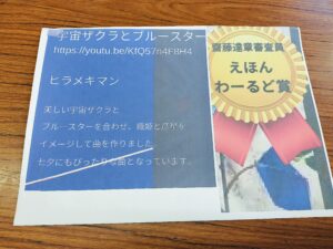 宇宙サクラとブルースターの歌を作り、ゆめピックに応募したところ絵本ワールド賞、準グランプリを頂きました。